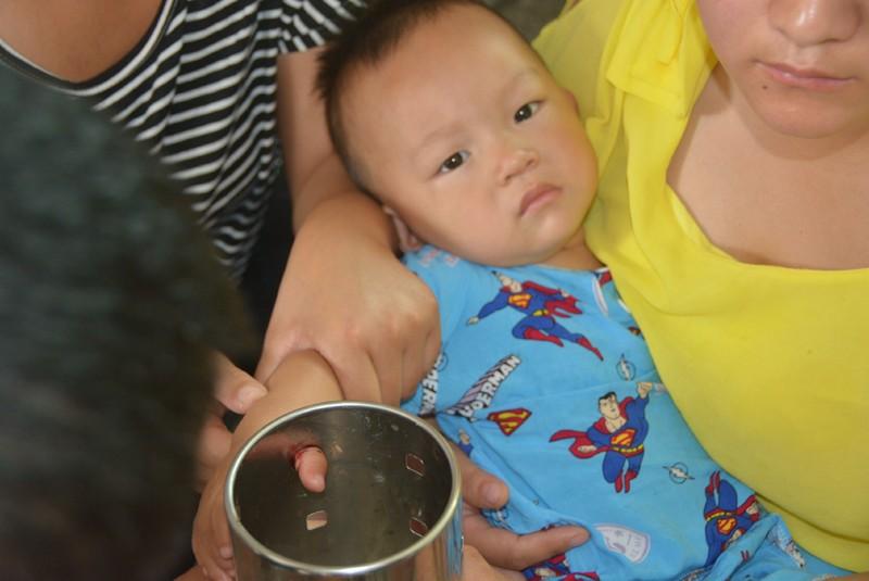 2016年7月5日,安徽蕭縣一歲男童右手拇指被卡筷簍孔洞,無法取出。(王保勝 楊亞 攝)民聲供稿平臺 發