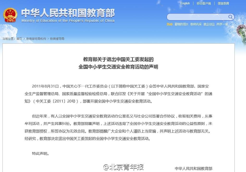 教育部的聲明寫道,近年來,有人以全國中小學生交通安全教育活動辦公室名義與社會公司簽署合作協議,收取相關費用,從事牟利活動,并產生民事糾紛。教育部鄭重聲明,上述活動違背了全國中小學生交通安全教育活動的公益性原則,未獲教育部授權,所簽協議為無效合同。教育部提醒廣大企業和個人謹防上當受騙,并聲明上述活動與教育部無關。經研究,教育部決定退出中國關工委發起的全國中小學生交通安全教育活動。