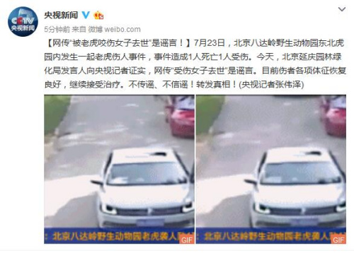 【網(wǎng)傳“被老虎咬傷女子去世”是謠言!】7月23日,北京八達(dá)嶺野生動(dòng)物園東北虎園內(nèi)發(fā)生一起老虎傷人事件,事件造成1人死亡1人受傷。今天,北京延慶園林綠化局發(fā)言人向央視記者證實(shí),網(wǎng)傳“受傷女子去世”是謠言。目前傷者各項(xiàng)體征恢復(fù)良好,繼續(xù)接受治療。不傳謠、不信謠!轉(zhuǎn)發(fā)真相!(央視記者張偉澤)