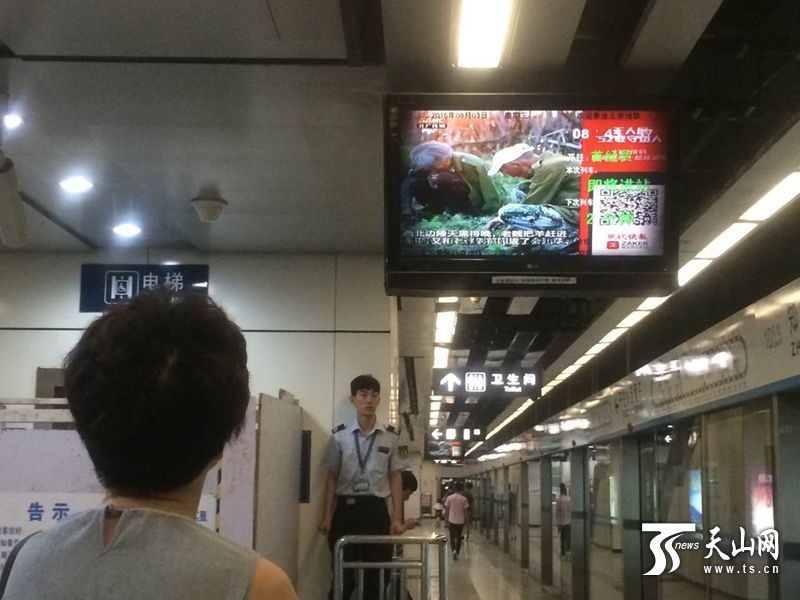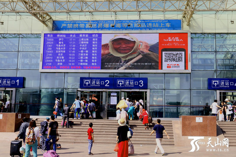 8月3日,烏魯木齊市火車南站站前廣場,大屏幕上正播放著《無人區·52載守邊人》公益短片。
