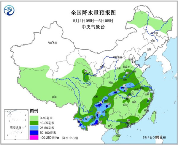 降水方面,今天白天到夜間,貴州中西部、云南中南部、四川盆地東南部、湖北西部和北部、河南南部等地有大雨或暴雨,其中,云南東南部的局部地區有大暴雨(100~120毫米)。上述局地并伴有短時強降雨、雷暴大風或冰雹等強對流天氣。