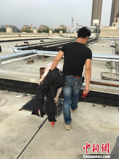 圖為“盤踞”無錫某商場樓頂多日的長發人體模型。 秦崢 攝