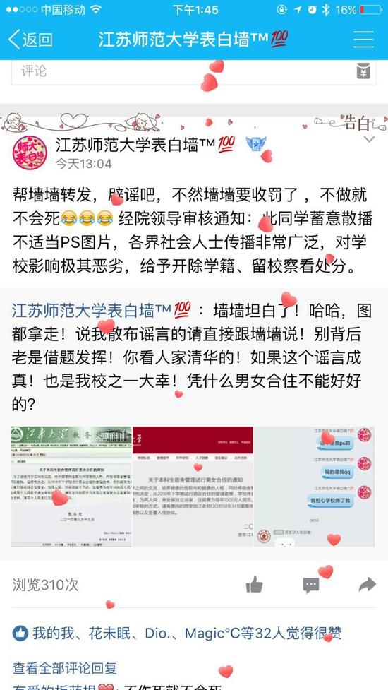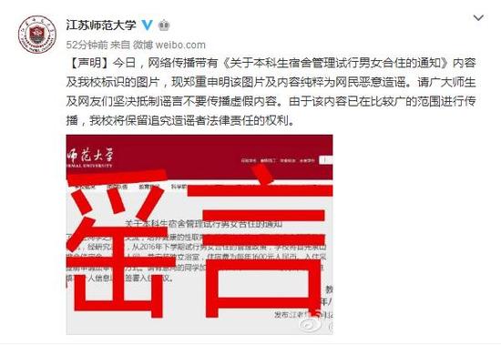 現(xiàn)代快報(bào)訊(記者 李偉豪)8月20日上午,一條截圖在微信朋友圈迅速傳開。截圖顯示是江蘇師范大學(xué)官網(wǎng)發(fā)布的一條通知,通知稱校方共2016年第二學(xué)期開始,可以申請男女合住。不過,很快,該校便通過官方微博辟謠,表示此為惡意造謠,保留追究造謠者發(fā)了責(zé)任的權(quán)利。