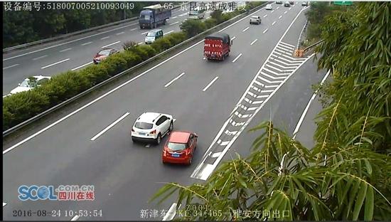 記者從高速交警提供的視頻看見,當天10時53分許,一輛紅色的小車快要開過成雅高速新津東出口時,突然從右側第二車道變道到第三車道,準備碾壓導流線開出出口。不過,駕駛員在原地停了兩秒鐘,這時,更大膽的一幕出現了,紅色小車開始慢吞吞的在高速路上“蛇形”倒車。只見這輛車左一盤子、右一盤子,在第三條車道和第二條車道之間拐來拐去向后倒車,花了32秒的時間在高速公路上倒車了20米的距離,這期間,不停有大貨車、小車按著喇叭從紅色小車的左邊、右邊快速開過,場面非常緊張。