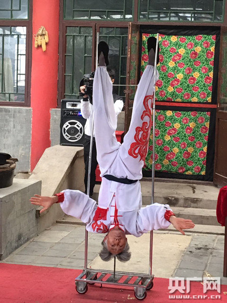 劉文昌表演頭頂鋼針倒立(央廣網記者張穎 攝)