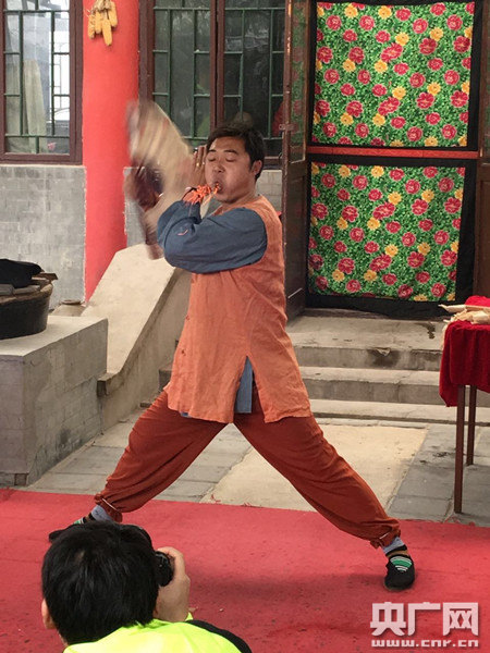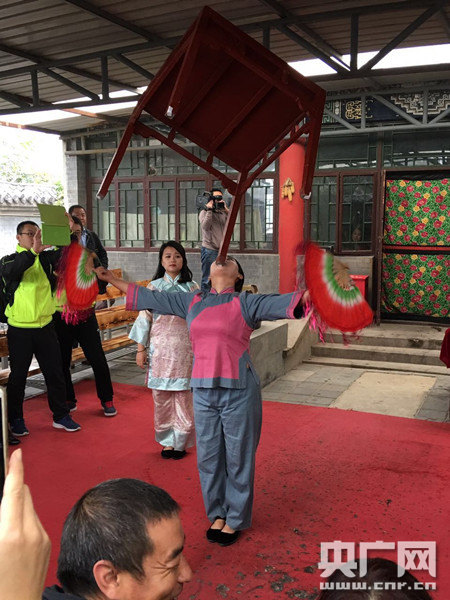 劉文昌的家人在表演用下巴舉桌子(央廣網記者張穎 攝)
