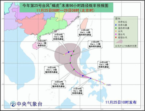 大風預報:受“蝎虎”和冷空氣的共同影響,25日14時至26日14時,福建沿海、廣東沿海、海南沿海、臺灣沿海、東海西南部、臺灣海峽、臺灣以東洋面、巴士海峽、北部灣、南海北部和東南部海域的風力有7~8級,臺風中心經過的附近海域風力可達9~10級。