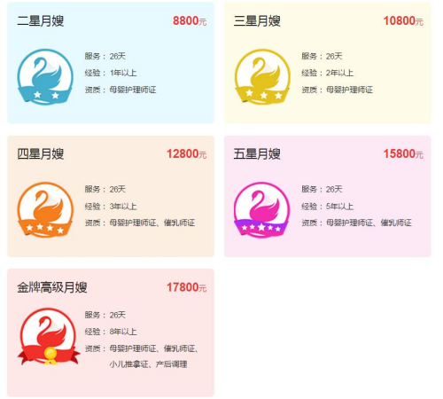 一家生活服務(wù)平臺(tái)公開的月嫂價(jià)格顯示,在北京提供26天服務(wù),二星月嫂需要8800元,三星月嫂10800元,四星月嫂12800元,五星月嫂15800元,最高級(jí)別的金牌高級(jí)月嫂則要17800元。