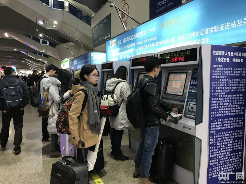 1月13日,春運首日,廣州南站,自助取售機前旅客排隊取票。