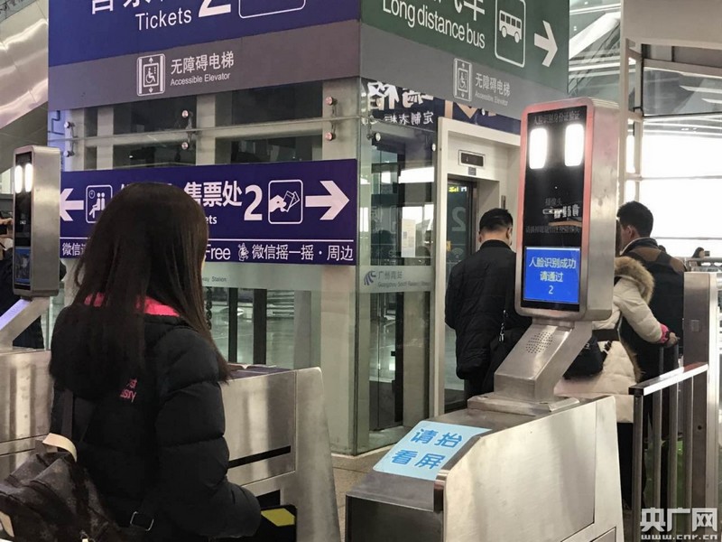 1月13日,春運首日,廣州南站,旅客體驗“刷臉”驗票進站,在工作人員引導下幾秒完成進站 。