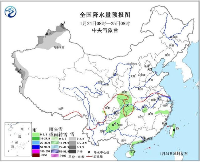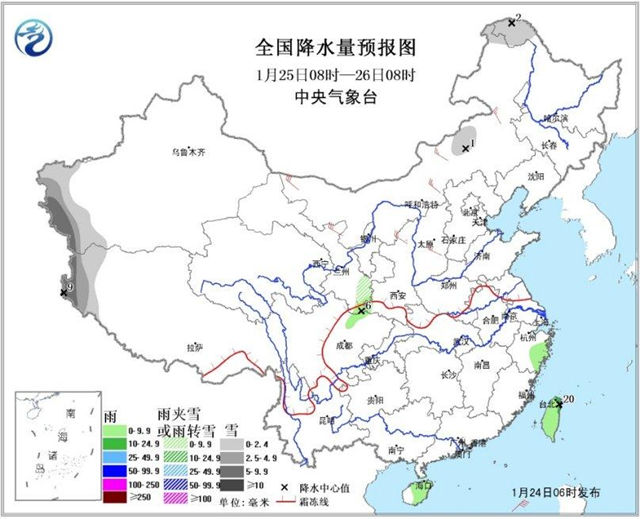 24日08時至25日08時,新疆北部與西南部的部分地區有小到中雪,局地大雪;陜西南部、四川盆地西南部和東北部、重慶中東部、湖北西部、貴州中西部、海南島、臺灣等地的部分地區有小雨或陣雨,局地中雨。臺灣海峽、南海東北部和中東部偏北海域有7~8級、陣風9~10級的東北風。