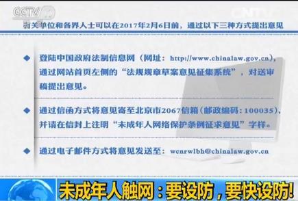 這個條例的征求意見截止日期到1月6日,在這之前,可以過三種方式提出意見——一個是通過登錄中國政府法制信息網的方式提出意見,另外一個過寄信的方式寄到一個北京市2067信箱,還有一個過電子郵件的方式把意見發到郵箱wcnrwlbh@chinalaw.gov.cn里面。這樣的條例準備出臺要面對的是一個什么樣的問題呢?這個問題是非常現實的,因為現在對于未成年人來說觸網的年齡更加提前了,觸網的范圍更加擴大,觸網的程度更加復雜……面對這么一個迫在眉睫的問題,面對普遍家長們非常關心孩子們成長的問題,條例會怎樣解決呢?