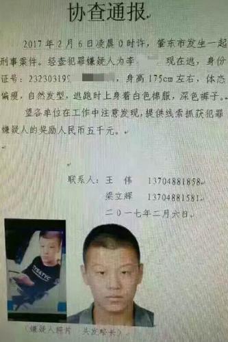 記者從警方了解到,雙方因打仗發(fā)生命案,嫌犯李某致一人身亡,一人重傷在哈市搶救。李某1995年出生,體態(tài)偏瘦,自然發(fā)型,逃跑時(shí)上穿白色棉服,深色褲子。目前,肇東警方正全力抓捕嫌犯中。