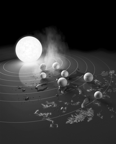 利用斯皮策觀測到的數據,團隊精確測量了7顆行星的大小——質量最小的約為0.4個地球,最大的約為1.4個地球;團隊還首次估計了其中6顆的質量,并認為它們都可能是巖態行星,但最外側的第7顆行星質量還沒估算出來,科學家認為,它可能是個冰冷的雪球狀世界。