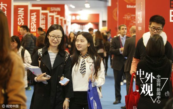 2016年10月22日,北京中國國際教育展上,學生和家長在參觀出國留學展臺。視覺中國