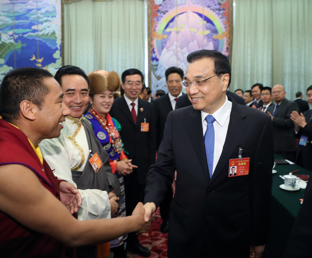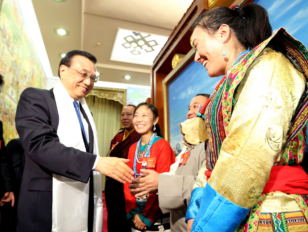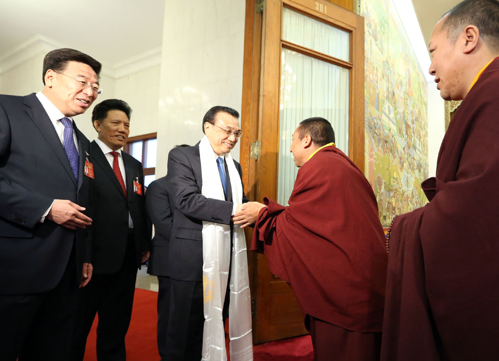 國際在線消息(記者 翟磊):李克強總理7日上午來到十二屆全國人大五次會議西藏代表團,參加審議政府工作報告。五位藏族、珞巴族、門巴族代表向總理獻上潔白的哈達。 -