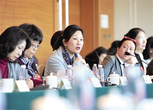 3月7日上午,全國政協婦聯界別翟美卿委員(中)在小組討論中建議要加快信用體系建設,只有堅持誠信為本,市場才能更加公開公平公正。本報記者 高興貴攝
