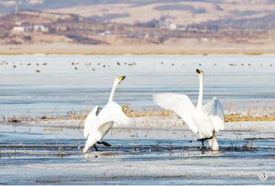 放眼望去,偌大的濕地水岸相依,沼澤遍布,龐大的天鵝群點綴數公里,尤其在水面寬闊處,成群的天鵝相擁相簇,或悠閑漂游,或嬉戲覓食,“嘎嘎”的叫聲宛若大自然天籟之音的合奏(圖③,張衛東攝)。