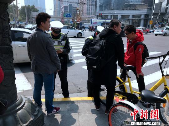 上海南京西路華山路路口,兩名交警對(duì)三名在機(jī)動(dòng)車道騎行共享單車的人員進(jìn)行處罰。 王子濤 攝