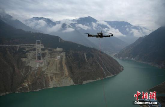 資料圖:2016年12月20日,“川藏第一橋”雅康高速大渡河特大橋架纜 。中新社記者 劉忠俊 攝