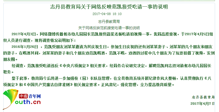 中國青年網(wǎng)北京4月9日電(見習(xí)記者 劉利影)日前一則“延安志丹縣侯市鄉(xiāng)幼兒園園長酒桌不雅視頻”在網(wǎng)上傳播。4月8日下午,志丹縣教育局在官網(wǎng)發(fā)布通報(bào)稱,針對網(wǎng)絡(luò)微博傳播候市幼兒園園長范凱接受蔬菜老板吃請拍視頻一事,經(jīng)調(diào)查,范凱接受吃請違反《中央八項(xiàng)規(guī)定》相關(guān)要求,解聘范凱同志雙河鎮(zhèn)候市幼兒園園長職務(wù)。