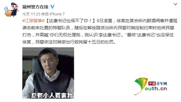 中國(guó)青年網(wǎng)北京4月10日電 據(jù)微博認(rèn)證為“安徽省阜陽市潁州公安分局”的賬號(hào)@潁州警方在線發(fā)布消息稱,8日凌晨,徐某在某會(huì)所內(nèi)醉酒鬧事并謾罵襲擊前來處置的特警隊(duì)員,隨后在解放路派出所內(nèi)民警對(duì)其控制約束時(shí)他將民警打傷,并高喊“你們無權(quán)處理我,我認(rèn)識(shí)‘李達(dá)康書記’。”