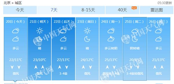 今天北京將是晴到多云的天氣,氣溫將有所回升。北京市氣象臺預計,今天白天晴轉多云,山區有小陣雨,北轉南風二三級,最高氣溫22℃。夜間多云間晴,南轉北風二三級,最低氣溫10℃。