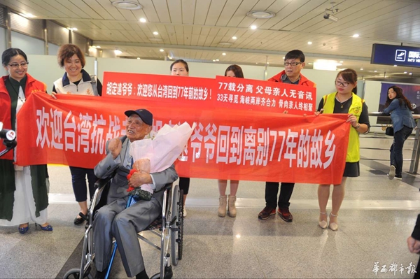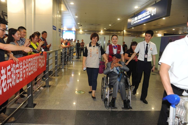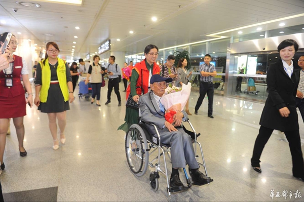 當晚9點45分左右,胡定遠坐在機場提供的輪椅上,出現在了眾人的視野里。面對前來迎接的志愿者,胡老微笑著,點頭、揮手以示回應,還用地道的瀘州話不斷說著“謝謝”。同時,他的目光始終在打量周圍的景象,70余年時光飛逝,這里的景象早非當年。“估計老家沒人認識我了。”胡老輕嘆。