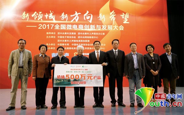團(tuán)中央“青年之聲”微電商服務(wù)聯(lián)盟副主席、海名微微電商平臺總裁、新西蘭紐西之謎中國區(qū)首席代表劉曉坤(左五)向北京授漁計劃公益促進(jìn)中心捐贈海名微公司價值500萬元產(chǎn)品,授漁計劃公益促進(jìn)中心秘書長高繼輝(左三)接受捐贈。左四為十一屆全國人大常委會副委員長周鐵農(nóng)。中國青年網(wǎng)記者李鐵攝