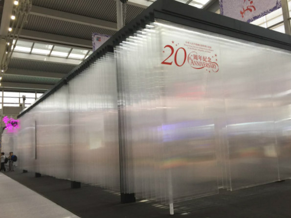 香港館的整體建筑設(shè)計(jì)是躺臥著的一棟大廈,99片略帶透明的PC板將整個(gè)展館分隔成“九十九層樓”。正面看是一個(gè)封閉的空間,側(cè)面看則是內(nèi)里連通著外部世界,寓意著從不同的角度看世界會(huì)有不同的發(fā)現(xiàn)