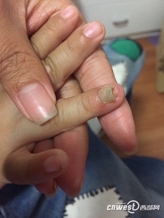 何女士說,“我們跑了幾家醫院后為了讓孩子少受點罪,跟醫生商量選擇保守治療,直到5月4日孩子的整個指甲翻起脫落!