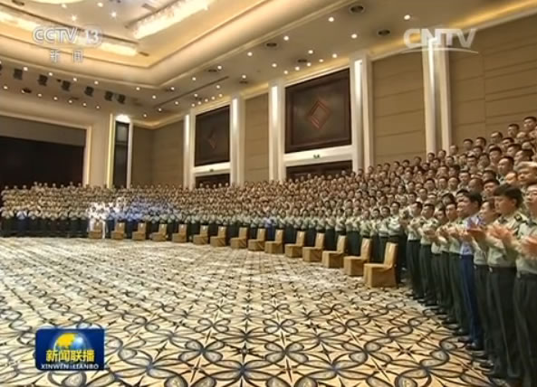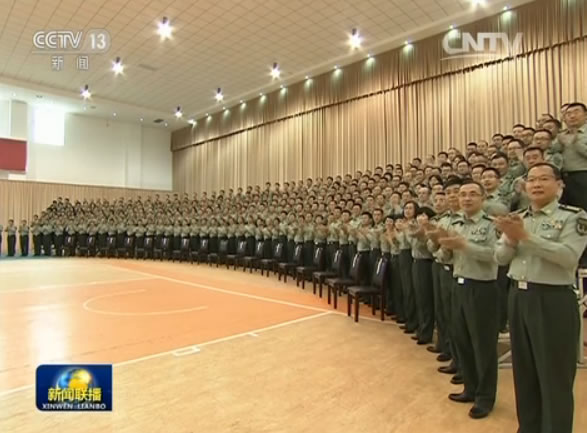 10時許,習近平前往基地文體中心,接見基地副團職以上干部,現(xiàn)場響起經(jīng)久不息的熱烈掌聲。習近平同大家親切握手、合影留念。