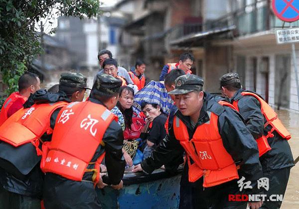 1日下午15時30分,長春垸新橋河鎮烈公橋段河堤又密集出現十二處小管涌,救災官兵來不及洗去臉上的泥土,又投入到緊張的救援工作中,兩個小時候,十余處險情全部被排除。6月30日下午18時,暴雨侵襲下的湘西沅江水位持續上漲,瀘溪縣境內浦市至武溪段全面超警。武警湘西支隊115名官兵連夜奮戰在一線,全力抗擊洪峰。在武溪鎮五里洲村,截至目前,該支隊共疏散、轉移群眾1000余人,排查化解各類安全隱患6起,裝填沙袋2000多袋,打好木樁500余個,幫助轉移財產物資50余萬元。1日凌晨5時,洪水漫灌懷化辰溪縣城,城區到處一片汪洋,全域進入防汛1級應急響應。懷化支隊50余名救援官兵迅速馳援,利用自帶皮劃艇和征用民用木船等手段,深入老城區中心轉移受困群眾800余人。救援中,一名高燒兩天多的4歲女孩被困3樓家中,該支隊參謀長王良華帶一艘皮劃艇避開縱橫交錯的架空電線,成功將其轉移至附近醫院。