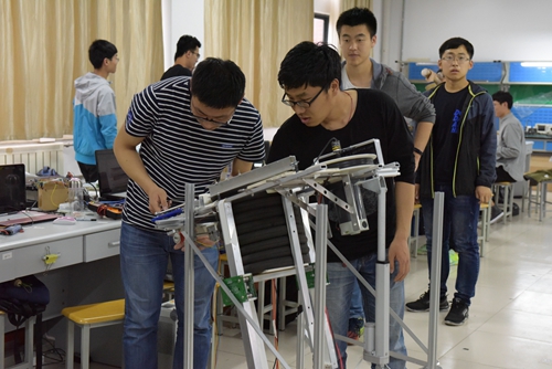 在第五屆山東省大學生機器人大賽前參賽隊伍調試機器人,最終獲總冠軍。