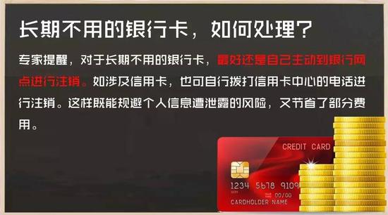 銀行工作人員建議,消費者對手上的銀行卡需及時分類處置、妥善保管。對于確實不再需要使用的銀行卡或存折,可到銀行辦理銷戶處理。