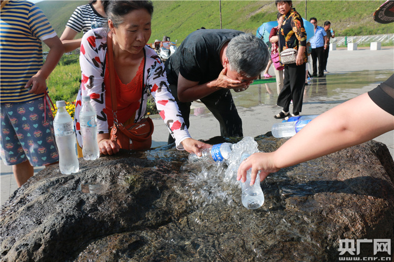 游客正拿礦泉水瓶取水直引。(央廣網記者 吳海波 攝)