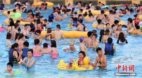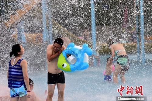 7月19日,游客在武漢市一水上公園戲水納涼。近日,湖北省武漢市持續高溫天氣,不少市民外出戲水納涼,體驗水上樂園推出的趣味活動。中新社記者 張暢 攝