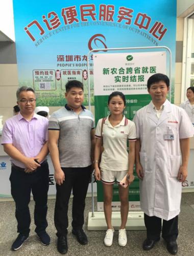 患者及家屬與深圳市龍華區(qū)人民醫(yī)院院長(zhǎng)羅新樂(lè)(右一)、信息科主任金洪長(zhǎng)(左一)