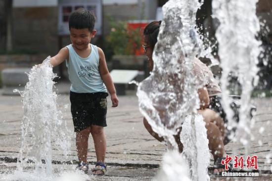 資料圖:7月25日,一名孩子在南京街頭的噴泉處戲水覓清涼。中新社記者 泱波 攝