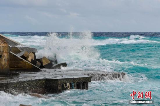資料圖:受臺風桑卡影響,23日西沙、中沙群島附近海面,西到西南風7-8級,陣風9級,三沙永興島附近海面掀起層層巨浪,拍打岸邊。 中新社記者 駱云飛 攝