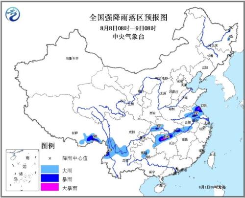 央廣網8月8日消息 據中央氣象臺網站消息,中央氣象臺8月8日06時繼續發布暴雨藍色預警:預計8月8日08時至9日08時,重慶東北部、湖北西部和東南部、湖南北部、安徽東北部和西南部、江蘇中北部以及西藏東南部、云南西北部等地的部分地區有大雨或暴雨,其中湖南北部、江蘇東北部等地的局部地區有大暴雨(100~150毫米);上述地區有短時強降水,局地伴有雷暴大風等強對流天氣,最大小時雨強可達50~80毫米。