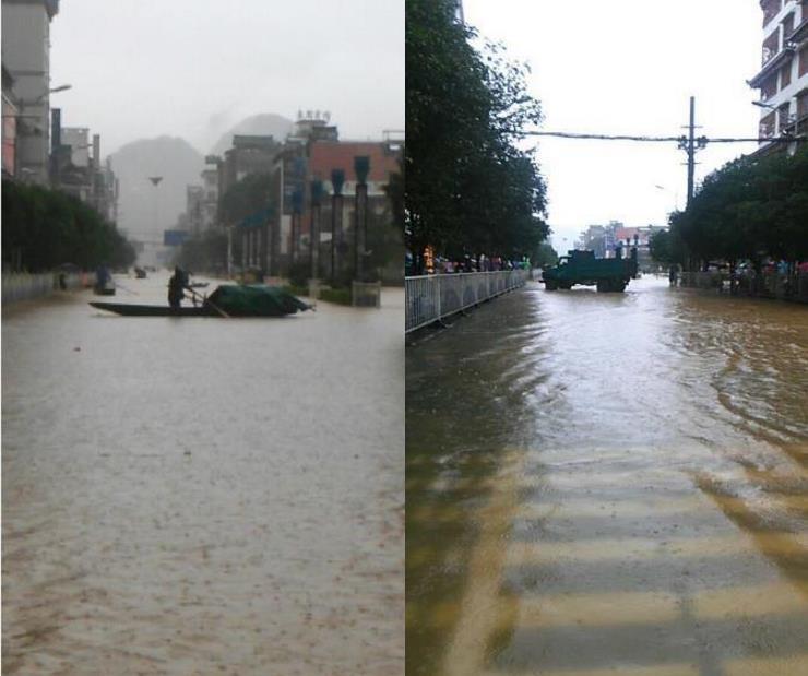 受上游持續(xù)強(qiáng)降雨影響,廣西融水縣融江水位猛漲, 13日晚上11點(diǎn)半左右,洪水開始涌入融水縣城,城區(qū)低洼地段被泡。