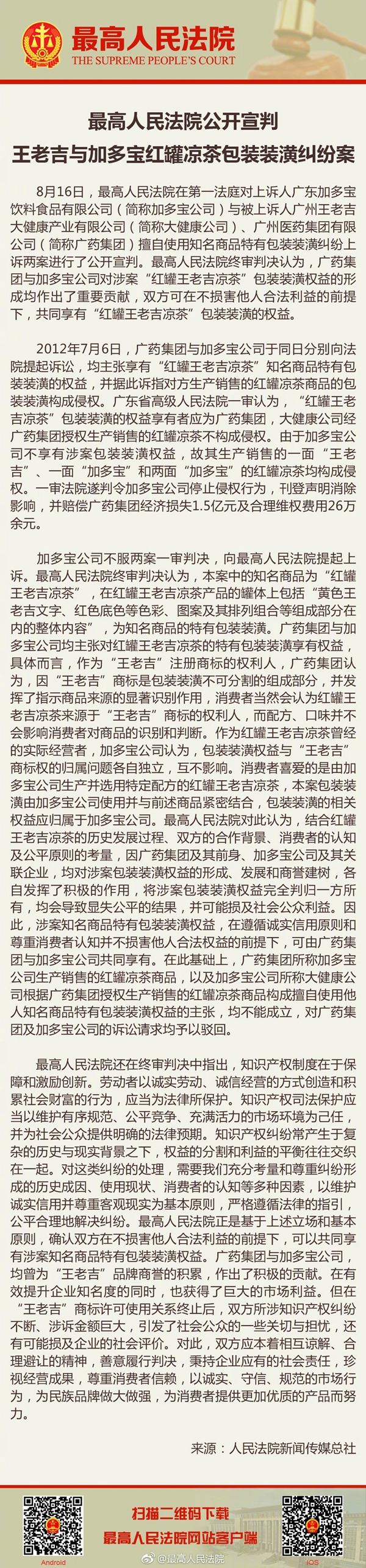 最高人民法院今天在第一法庭對上訴人廣東加多寶飲料食品有限公司(簡稱加多寶公司)與被上訴人廣州王老吉大健康產業有限公司(簡稱大健康公司)、廣州醫藥集團有限公司(簡稱廣藥集團)擅自使用知名商品特有包裝裝潢糾紛上訴兩案進行了公開宣判。