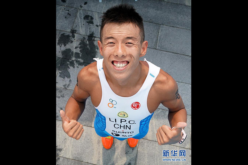 這是以個人名義參賽的業余選手李鵬程,在完成鐵人三項男子個人賽后留影(9月3日攝)。