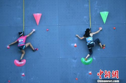 第十三屆全運會群眾項目攀巖決賽女子隨機速度賽比賽現場。 陳超 攝
