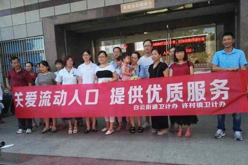 許村鎮衛計辦工作人員、流動黨員支部書記倪永泉和計生協會會長胡紅梅組織56個育齡婦女到白云街道醫院接受免費健康體檢。