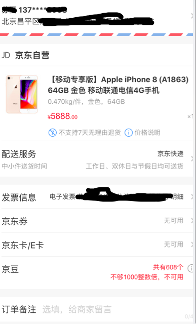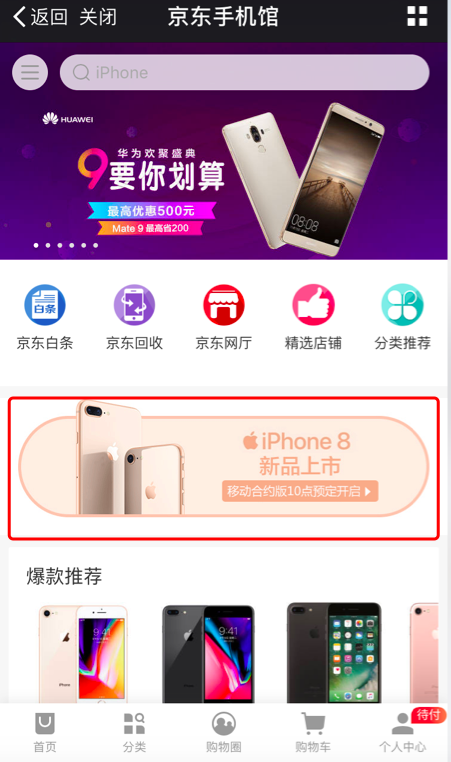 消費者可以在自己的微信“發現”頁面點擊“購物”,進入京東頁面點擊“京東手機”后,點擊iPhone 8新品上市的廣告,即可看到移動專項版的iPhone8售賣信息,點擊“立即購買”即可完成預購下單。具體操作示例如下: