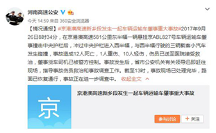 9月26日下午,河南省公安廳高速交警總隊(duì)官方微博@河南高速公安通報(bào)稱:京港澳高速新鄉(xiāng)段發(fā)生一起運(yùn)輸車肇事重大事故,造成12人死亡,1人重傷、10人輕傷。