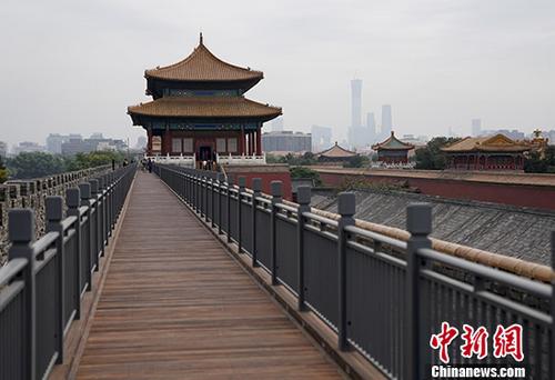 9月27日,北京故宮北城墻木棧道已鋪設(shè)完畢,即將正式開放。木棧道位于城墻中間,從神武門城樓可以直接走到東北和西北角樓,正對著景山公園,可眺望北海。 中新社記者 杜洋 攝
