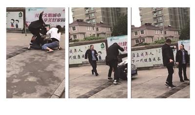 從監控視頻中,揚子晚報記者看到,電動車還未停穩,黑衣男子便沖了上來,拿著尖刀直接往藍衣男子的腹部插去,連續刺了四五刀后,藍衣男子便隨著電瓶車倒地,一旁拉架的白衣女子也被帶倒,但黑衣男子還是拿刀亂刺,倒地的男子強打精神爬起來往遠處逃,但是黑衣持刀男子緊隨其后,藍衣男子又被再一次帶倒。這時,駕駛私家車的女輔警立即下車,衣服還沒扣好便沖過去了。